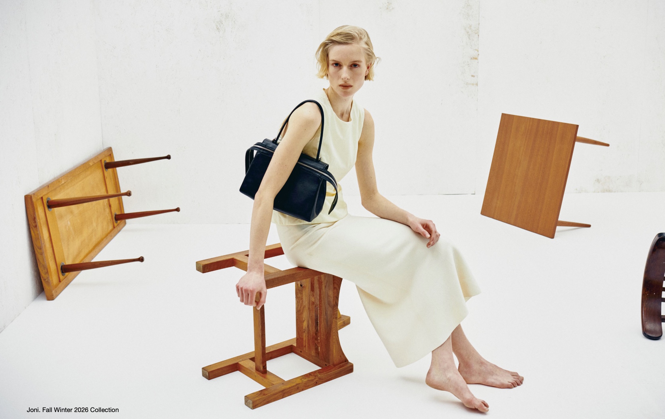 The campaign imagery supports that idea well. Across the lookbook, Ines Kraefft is styled in a world of pale interiors, overturned furniture, shadow play, and restrained gestures that mirror the collection’s emotional tension. The visual direction avoids theatrics but still feels cinematic, which makes the Bergman reference feel considered rather than cosmetic.