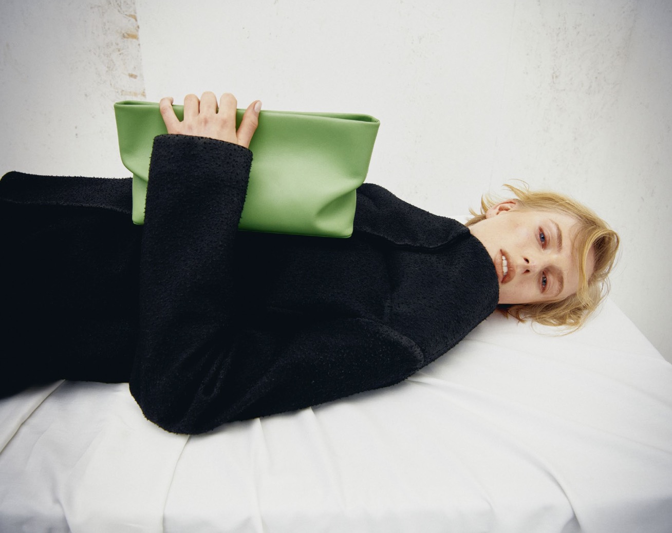 There is also a strong tactile tension running through the edit. The Nina Clutch appears in a striking acid green, bringing a sudden note of visual disruption to an otherwise controlled palette. The Mini Sac is rendered in a monochrome portrait format that sharpens its graphic appeal, while Cosmo Soft introduces a warmer, more rounded shape that gently offsets the stricter edges seen elsewhere.