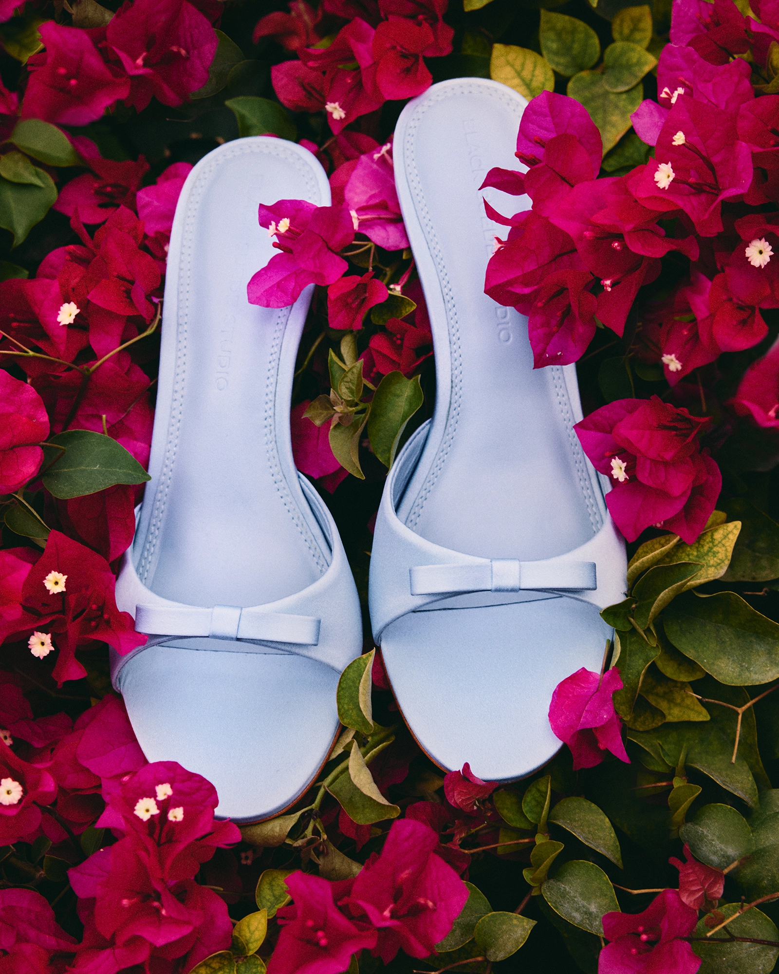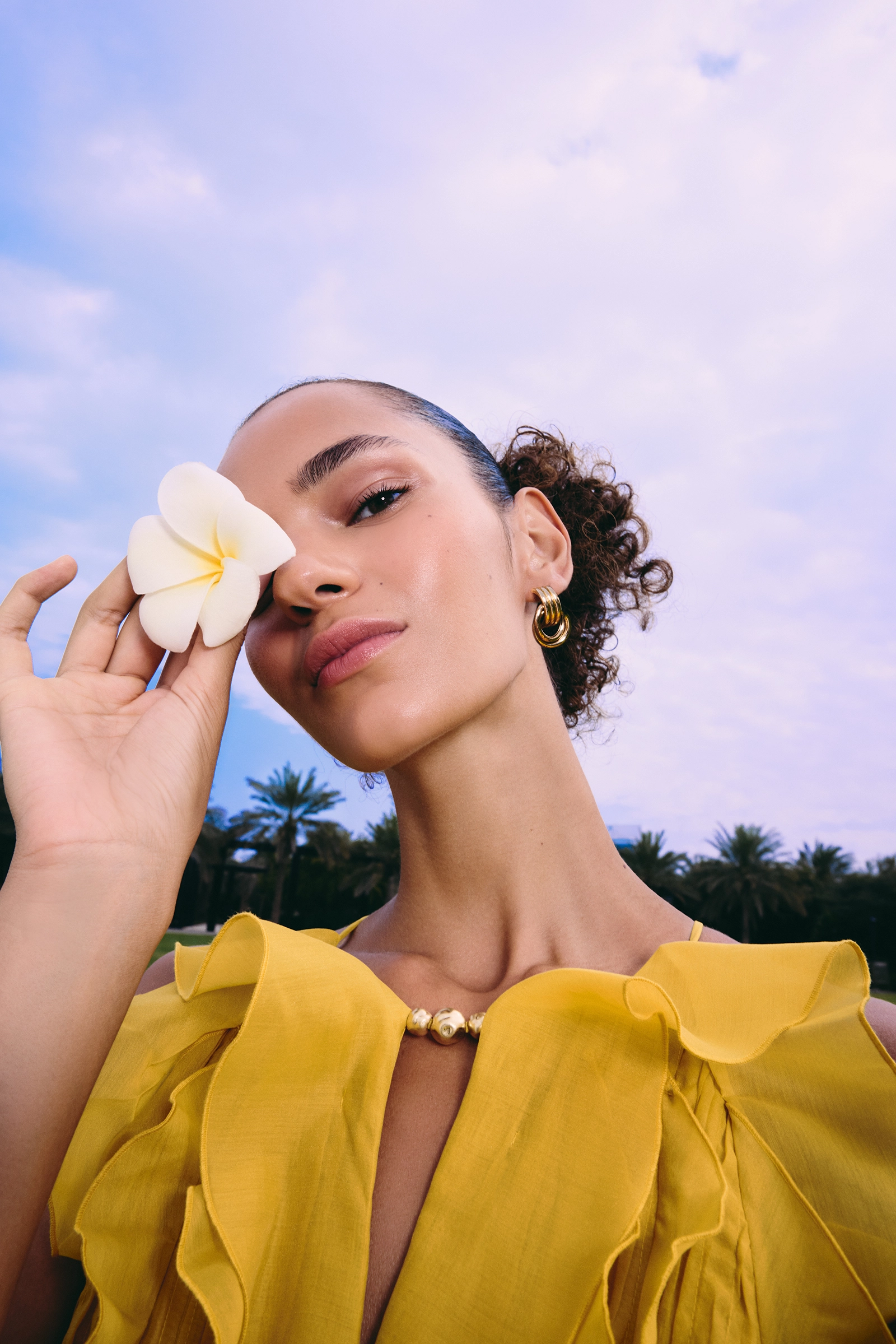 The campaign images say most of it before the clothes do. Flowers pressed against skin, a woman in a floral-embroidered modest look framed by garden foliage, white slides laid flat against bougainvillea. The mood is warm and unhurried, which is harder to achieve than it looks.