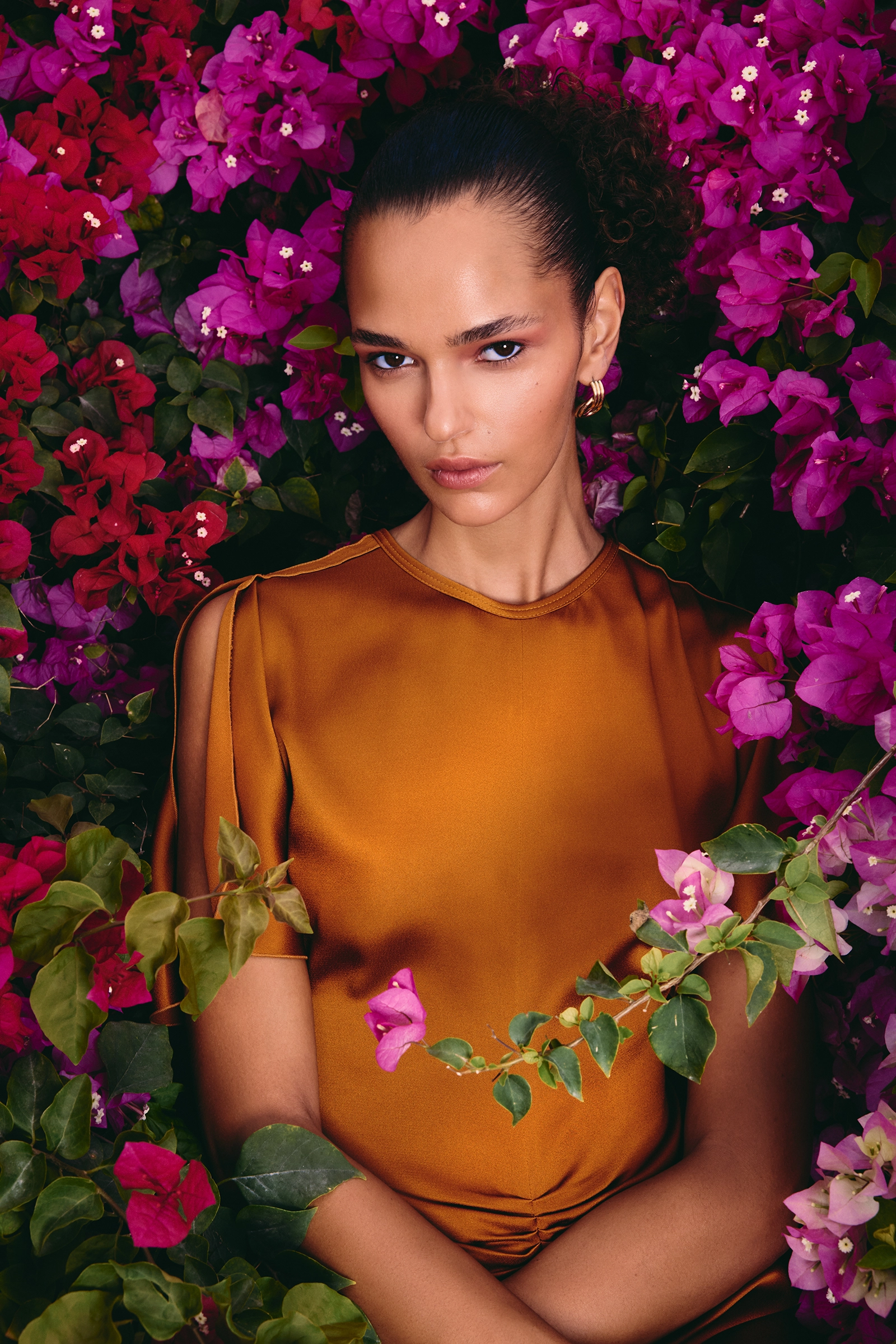 Beauty takes a similarly considered approach. The butterfly eye detail in the campaign imagery is the most striking moment, purple petals painted across the face with enough conviction to feel editorial rather than costume. Elsewhere, the beauty story stays close to the season: luminous skin, soft colour, the kind of finish that photographs well and wears well in equal measure.